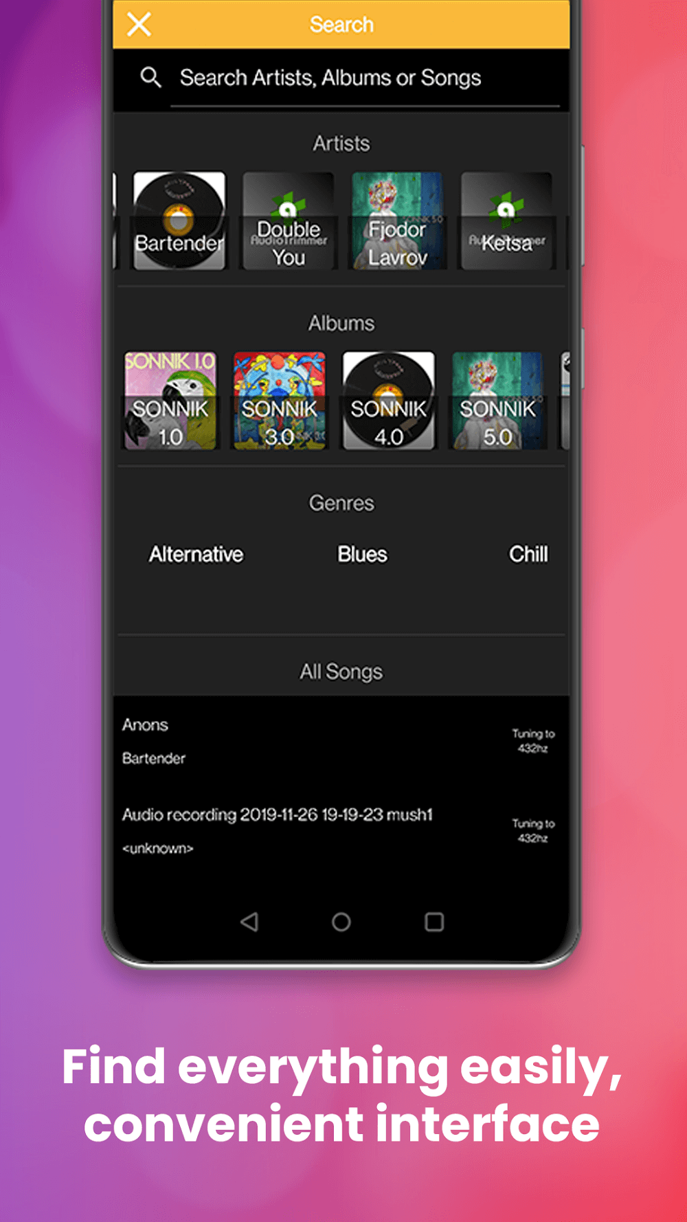 The app becomes an impressive music listening tool with powerful adjustment features. Everyone can choose their own experience by making available adjustments. At the same time, the resource system in the device will make it easy to find songs.