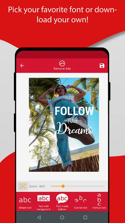 Add Text on Photo is not just about slapping some text on your favorite photo. Oh no! It’s about offering a treasure trove of options to make every picture a storytelling canvas. Want to insert your inner monologue inside a chic conversation balloon? Or perhaps drape a quote in a curved, whimsical style? The app stands ready to meet every imaginative whim. And for those who adore standing tall, the vertical letters will surely tickle your fancy.