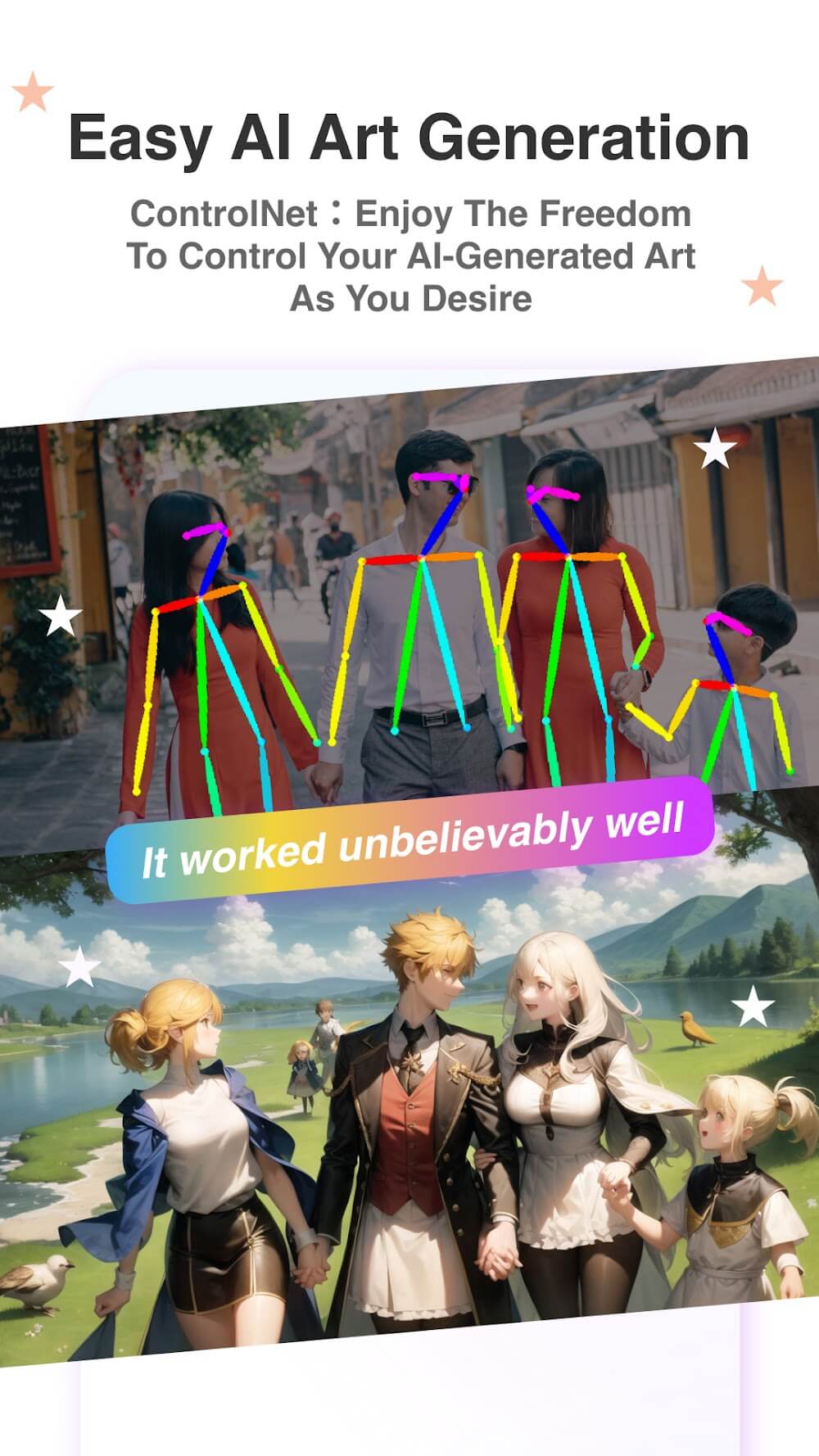 • ControlNet feature: ControlNet enables users to take control of their AI art by quickly generating beautiful pictures and learning from the information they upload.