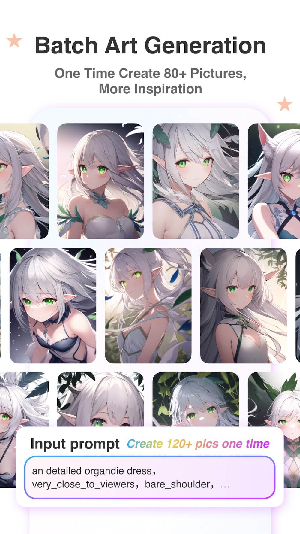 • Batch generation function: The AI art batch generation function supports more models, generating 100+ pictures at a time to provide more inspiration and allow users to create exclusive anime characters.