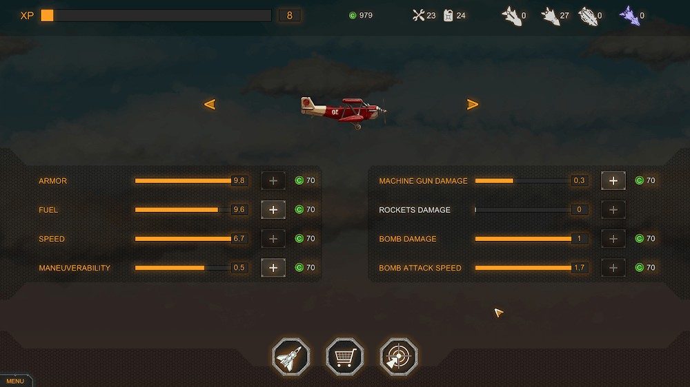 Aircraft Evolution allows players to fly through different enemy areas and attack them. Each place has a layer of defense and soldiers ready to shoot down your plane. But you are not weak and will launch different attacks until everything is leveled. The gameplay is more attractive and innovative, with light and diverse movements in the air, but requires high precision when dropping bombs. Strength is shown through attacks, weapons, and aircraft stats. Therefore, the rewards in each mission are used for upgrades.