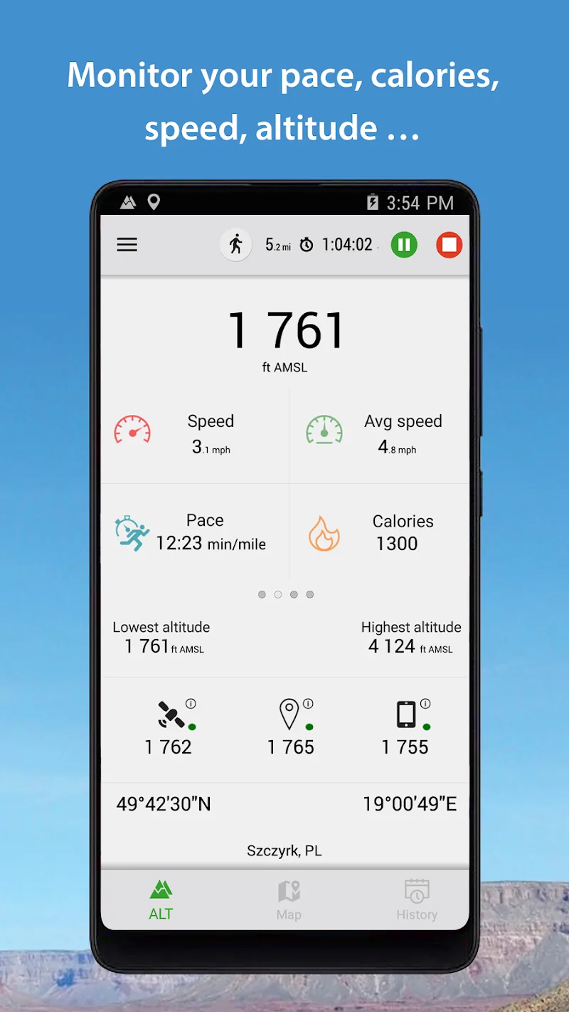 Altimeter presents its robust sensory measurements clearly on a real-time updated display. Key statistics like current elevation, maximum height reached and lowest point are displayed prominently and logged for post-trip analysis. A mini map additionally charts elevation changes on graphs to reveal the contours of your trip at a glance.