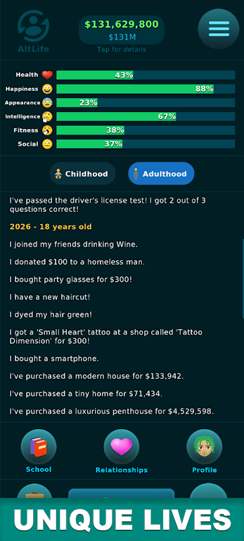 AltLife simulates real life and allows everyone to make the appropriate decisions they want. Everything focuses on choice, so players need to read the information carefully before making a decision. At the same time, you also need to pay attention to your age because time passes very quickly every time you press the Age button. Surely, everyone wants to achieve achievements and does not want to waste it on useless things. The game will satisfy that desire through aspects of life, from work to money. All are under your decision.