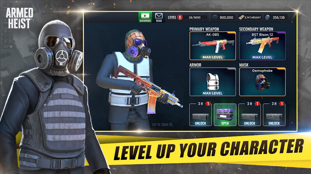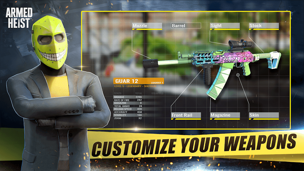 These are large-scale bank robberies, so you need to prepare carefully before committing. The game provides you with a series of interesting weapons, and you are allowed to choose according to your needs. Each gun will have an effect, and players need to determine their playing position, too. Especially when choosing a gun, you are also allowed to add new skins such as gun barrels, change bullets, etc. The game becomes more interesting when you choose the right weapon to fight strongly.