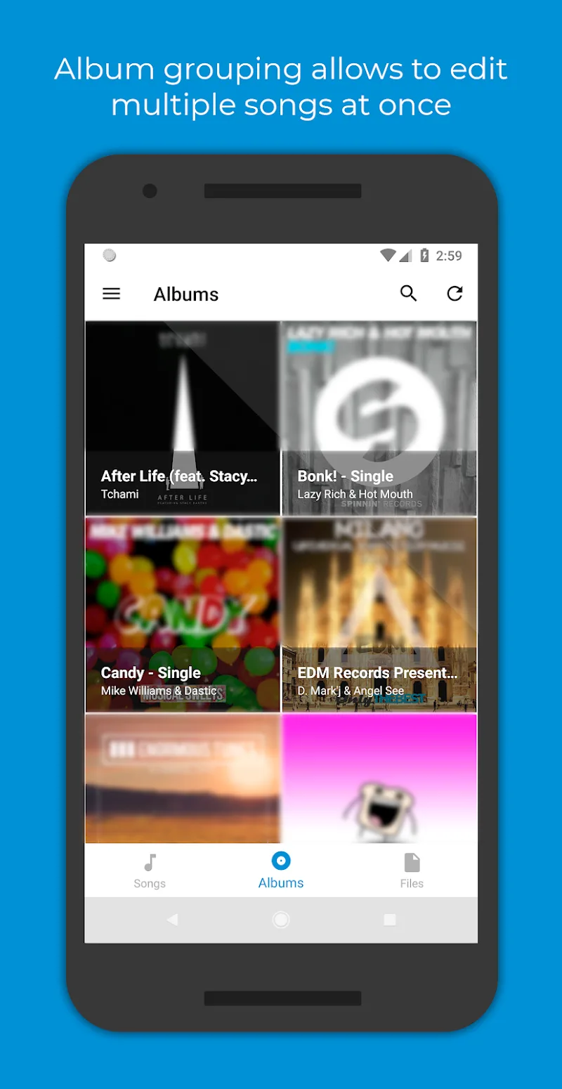 Finding high quality cover art can be a chore – let Automatic Tag Editor provide options automatically. After applying tags, it will suggest cleanly extracted cover art from the web to match the album and artist. Just review and select your favorite with one tap to embed eye-catching art. Now your library looks as great as it sounds! The cover art search works batch by batch to keep your library’s visuals consistently on point.