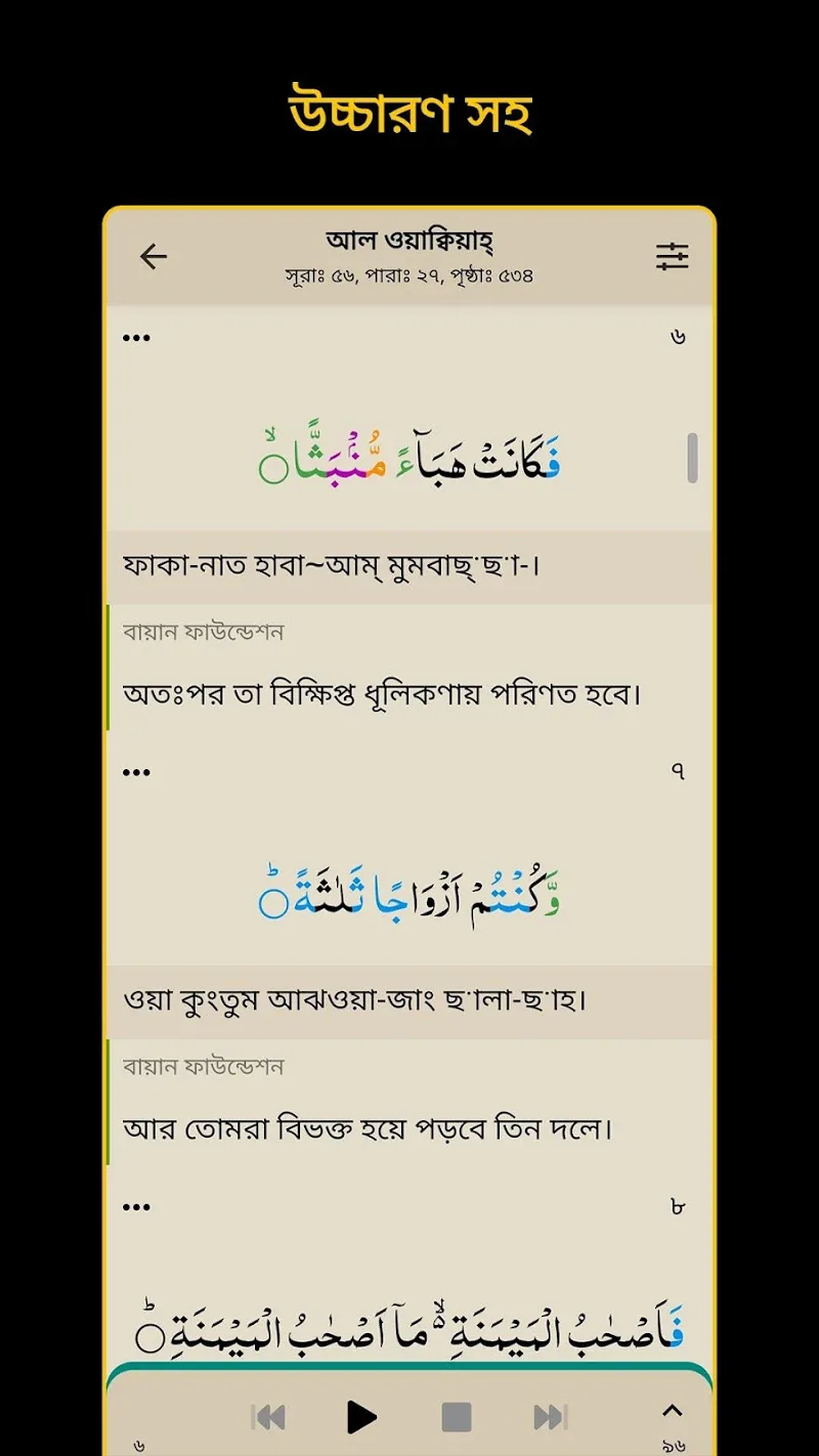 Bangla Quran -উচ্চারণসহ(কুরআন) provides you with tools to support reading, understanding, and memorizing the Quran according to your wishes. The interesting thing is that the application will support translation in many different languages, and users can freely memorize according to each language they know. Unique Quranic verses will be added, and the application will be automatically updated to save time effectively for users.