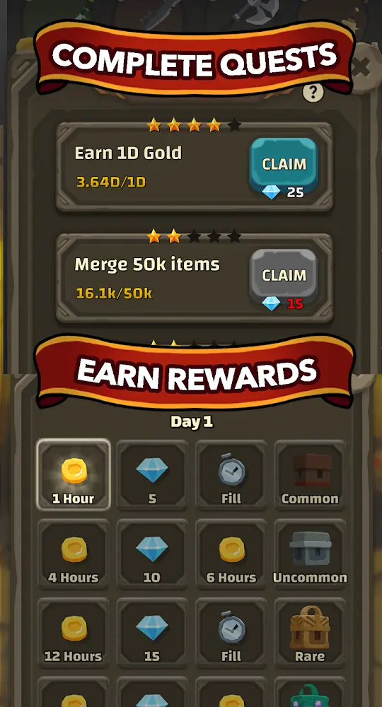 Players will go to a blacksmith shop and see slots that are used to store swords appear and help the player earn money. The player’s amount for each sword will be completely different because this amount will change depending on each sword level. One way used to create a sword with higher quality is to merge two materials of the same quality, and the player will do this repeatedly. Players will use support features by using the amount of gold or gems they have to activate the feature permanently or temporarily. Players can level up base materials to forge swords or unlock the automatic merge feature to make the merge faster.