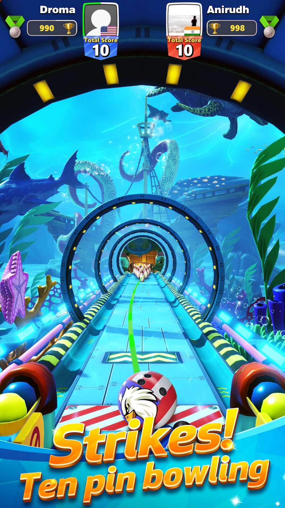 There are three bowling ball options: Accurate Ball, Fast Ball, and Big Ball. To hit a straight ball, select the Fastball, which is best suited for straight ball strikes. To throw the Ball, pull it back and drag it into the white circle area. Try to stick with the Arc ball and choose a Heavy ball to experience the Arc. Slice the blank area above the bowling ball and drag the Ball to the target area by sliding left and right, then move the Ball to the target area and release your fingers to throw out the bowling ball. And there are a total of 10 pins; if all ten pins fall in the first Ball through your bowling, then it is a Strike, or if it happens after the second strike, then it is a Spare, and if no Pin falls, then it is a Miss. It is a turn-based game, and bowling turns are given one after the other player. Compete with online players and show your talent in bowling Strikes and Spares so that no one can beat you.