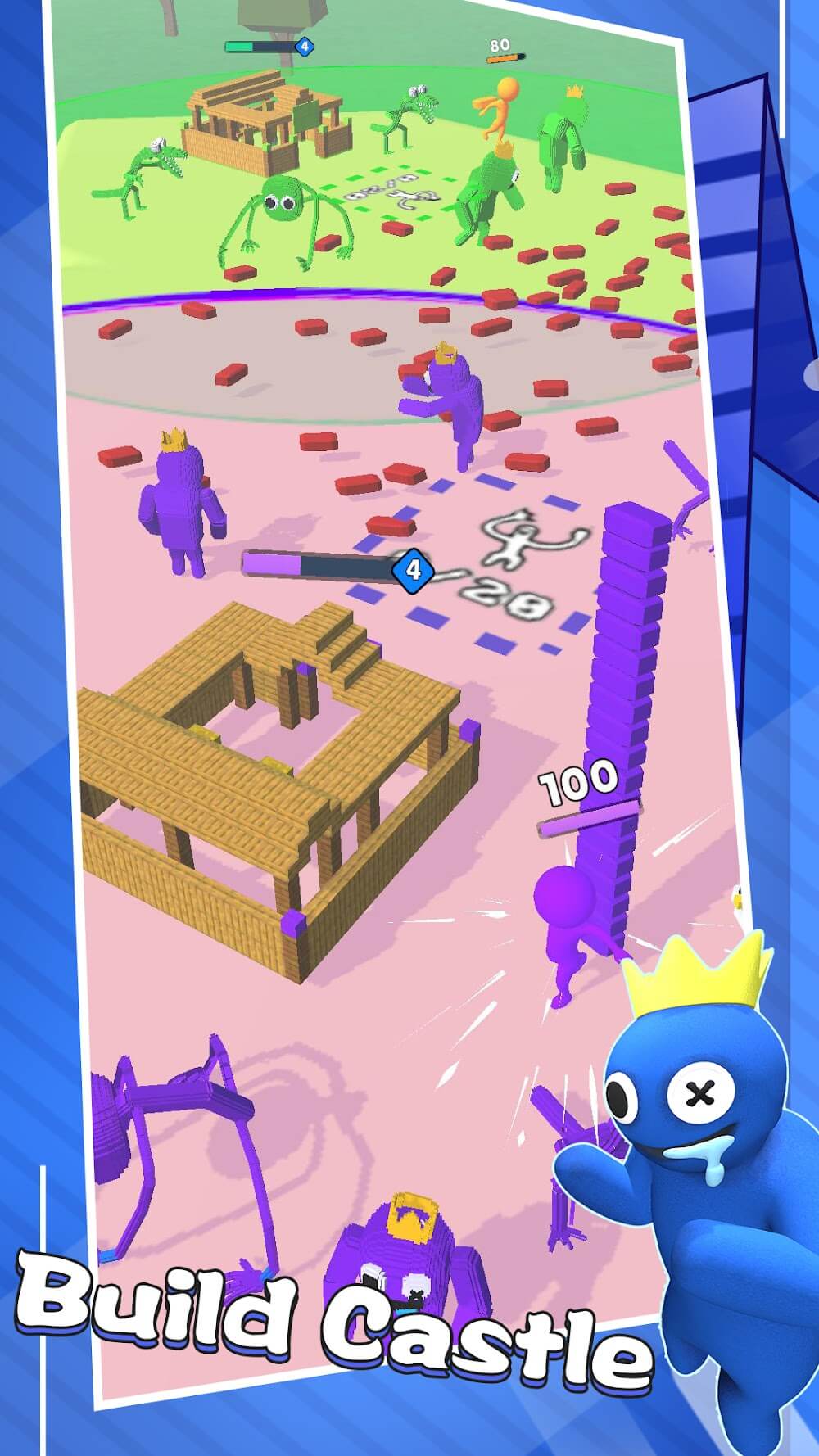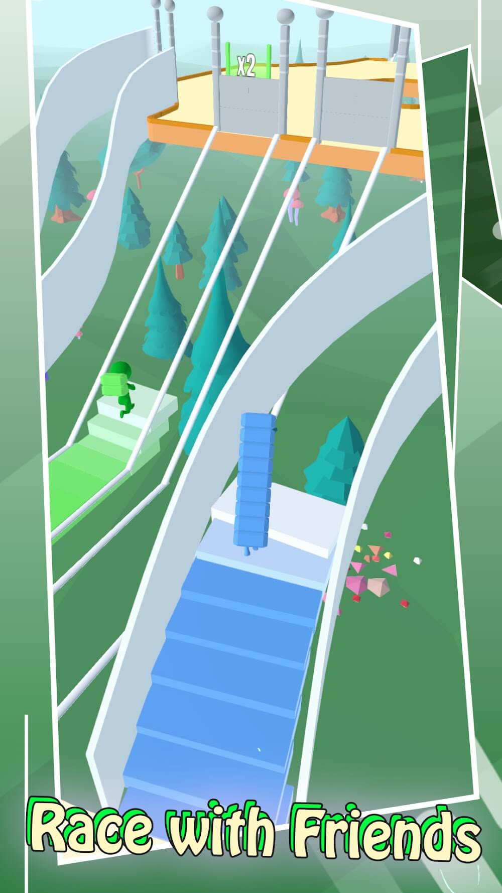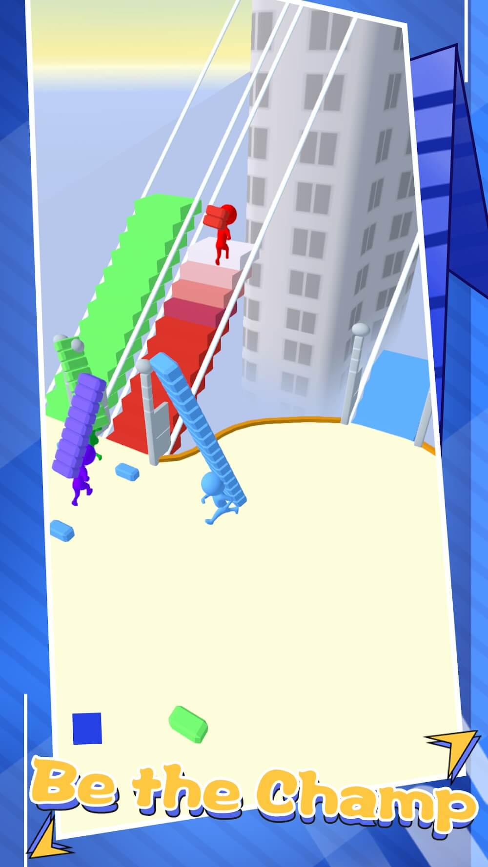 This game features an exciting game mode called bridge construction, in which you must collect bricks distributed along the path to continue building the bridge. The procedure is a race against the other players, and each participant has an objective to accomplish before the end of the competition. The system will select the winner in an objective and fair manner, and it will be based on how quickly the bridge can be built.