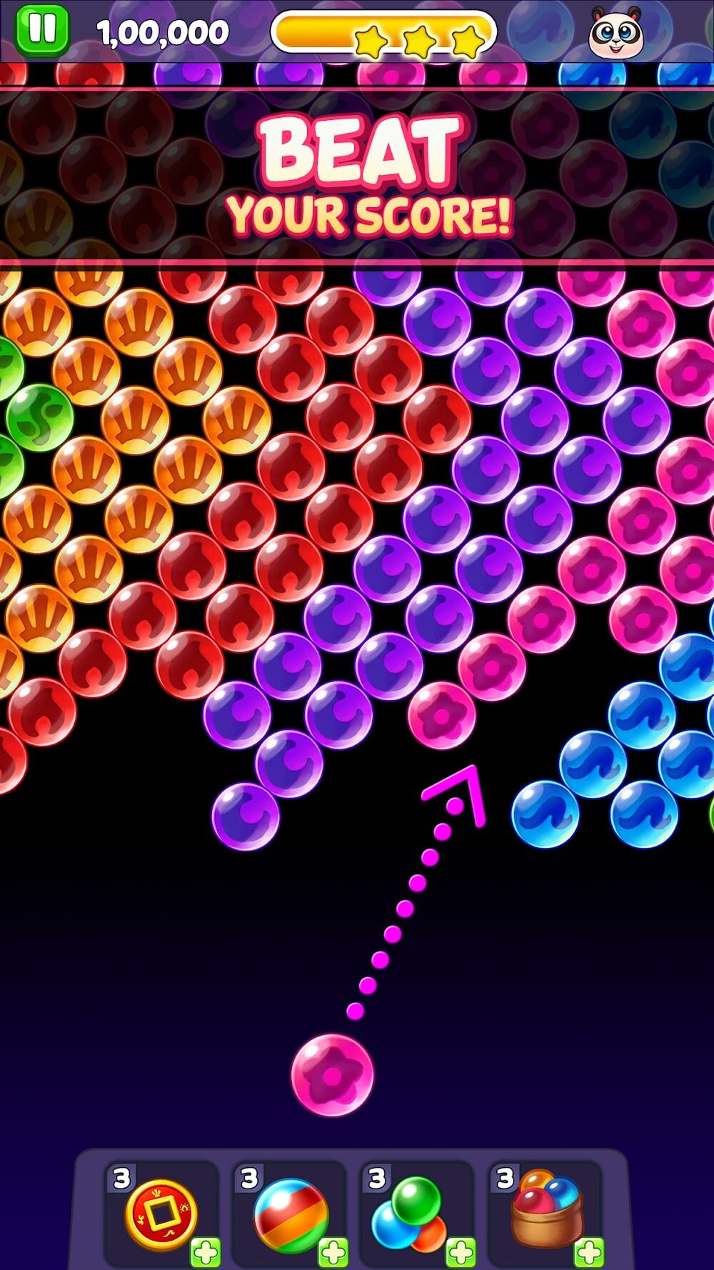 Bubble Shooter: Panda Pop! is a fun bubble shooting game. You will be responsible for filling the ball with many colors, such as pink, blue, and purple. After choosing the color of the ball to be fired, you look up and place the arrow in the corresponding position. At this exact moment, the three balls will combine and explode. A great force is generated when many balls of the same color are fired upwards. If the player does not play fast enough, the ball will be stretched indefinitely; losing is easy. You will successfully rescue the panda if you shoot all the cleverly positioned balls.