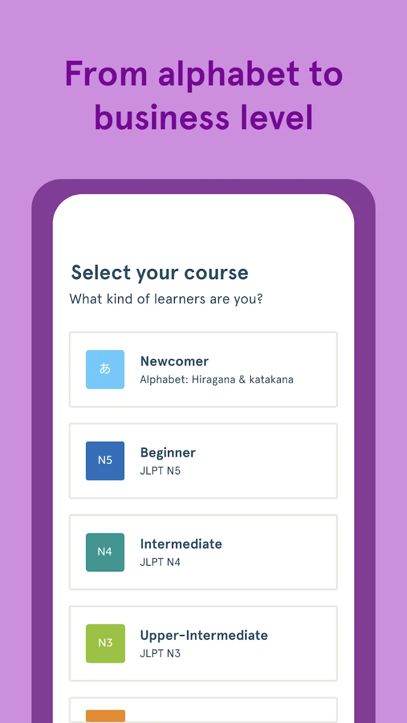 • Progressive Learning: The application’s learning programs are divided according to each level and the user’s language ability. The levels you can learn include all JLPT levels from N5 to N1. Users will have great private time to learn more progressively with this learning program.