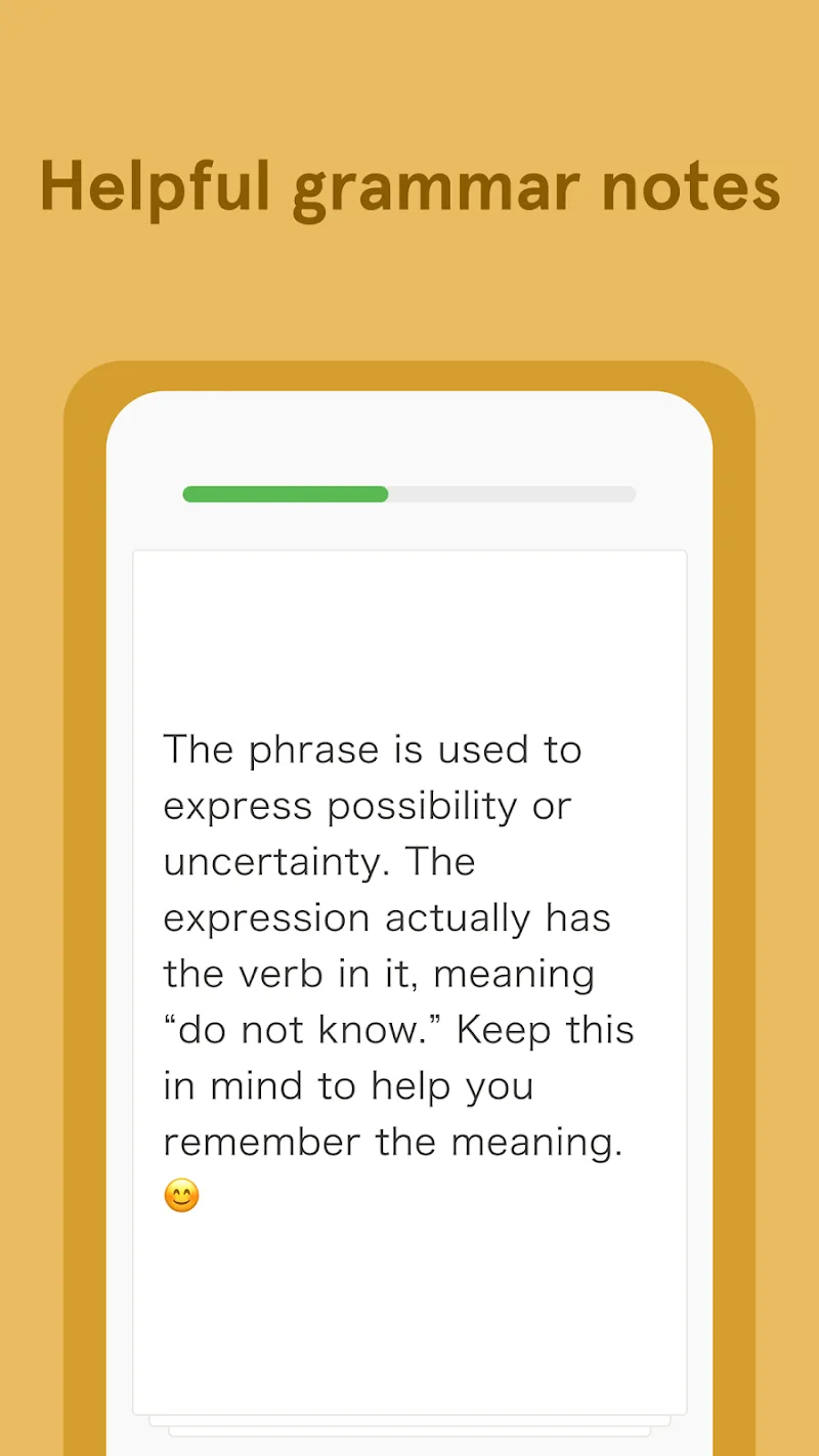 Grammar is a basic lesson when users approach a new language. The same goes for the Japanese. Users will learn many sentence patterns, from simple to advanced, to improve their ability to use Japanese. You can study more effectively according to pre-assigned levels and practice lessons.