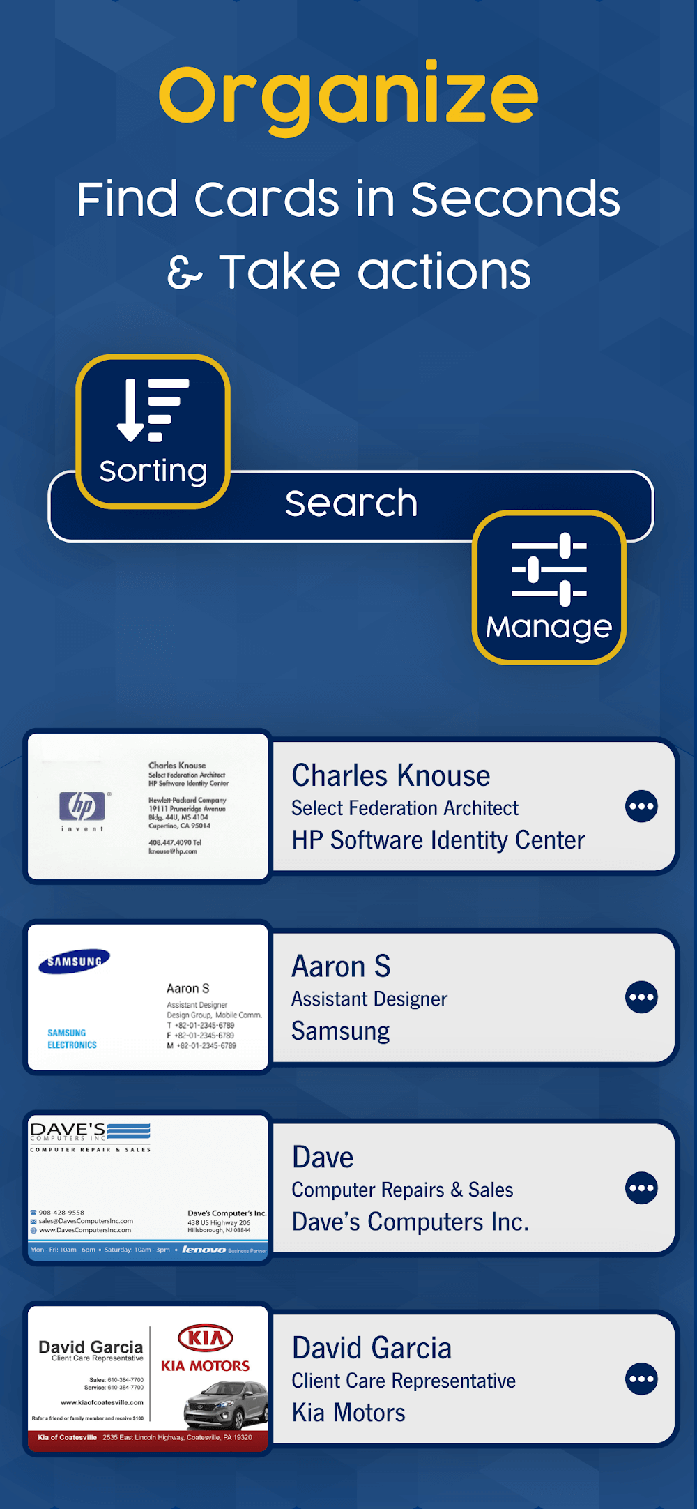 - Smart Contact Manager: The application also provides you with an extremely smart classification system, your business cards will be arranged by company name, date or other factors. You will quickly find the business card you need without having to search too long and wasting too much time.