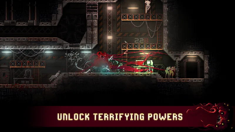 In addition to the regular army, the army also has a force that studies supernatural phenomena. One fine day, a meteorite fell on the outskirts of Florida, USA. The army immediately sent people to collect samples for analysis. In a secret basement under strict control of the army, extremely secret research activities are taking place. Outstanding scientists are conducting experiments on a creature with an unstable shape. They named it Carrion and this is also the setting of the game of the same name. This creature gradually becomes intelligent and it has found a way to escape. The player is transformed into that monster, hunting and slaughtering everything that gets in the way and finding a way to escape from this secret facility.