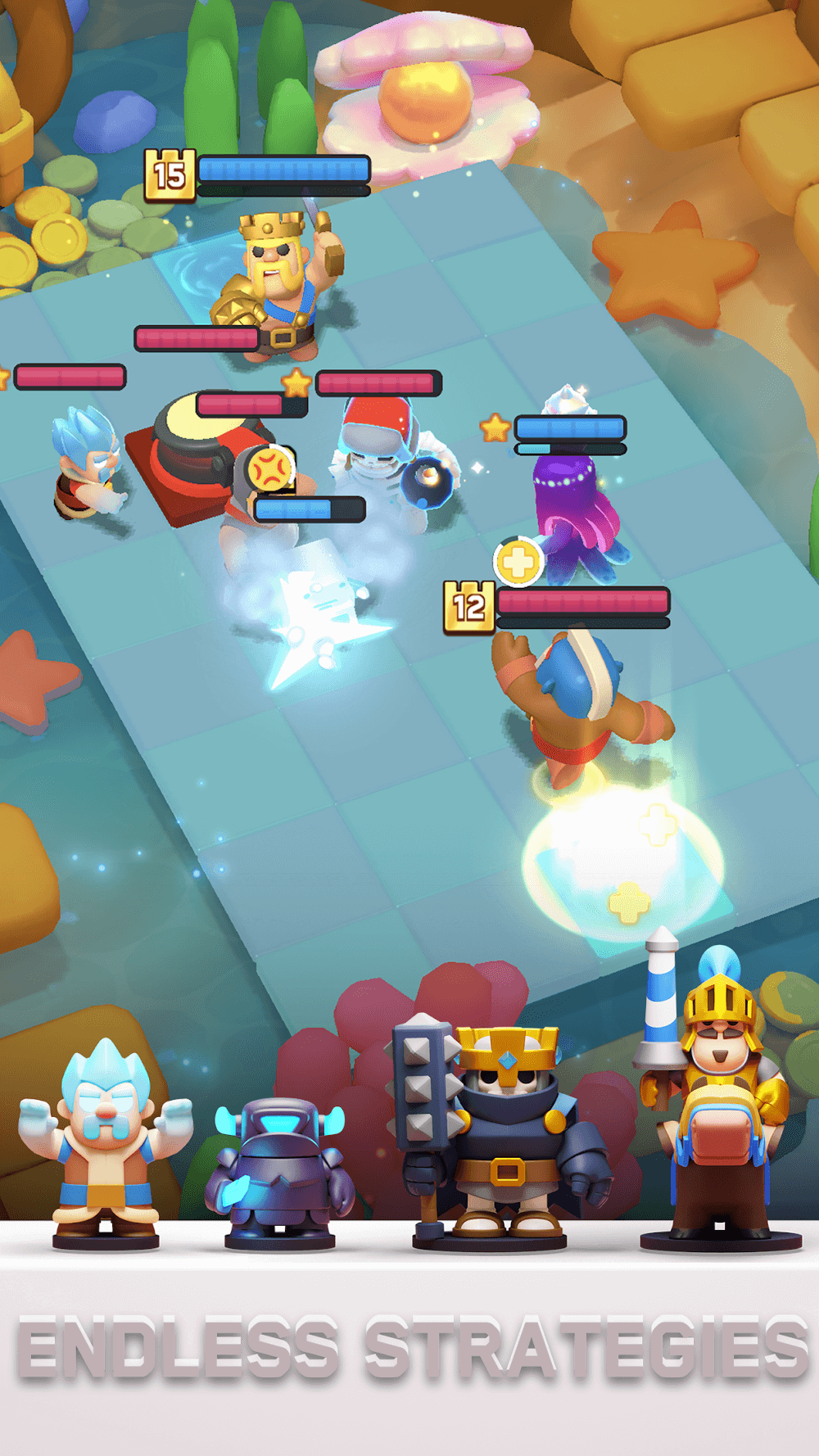 Clash Mini possesses an extremely rich and diverse hero system for you to summon and use their power. In addition, these characters all have their personality and appearance, along with a strong set of combat skills. They can be warriors with powerful attacks, magicians with many powerful skills, or assassins with huge amounts of damage. Moreover, these characters have roles in the squad, so you must choose an appropriate way to create the strongest team. In addition, you can also upgrade the stats as well as skills to maximize the strength of the characters before participating in new battles.