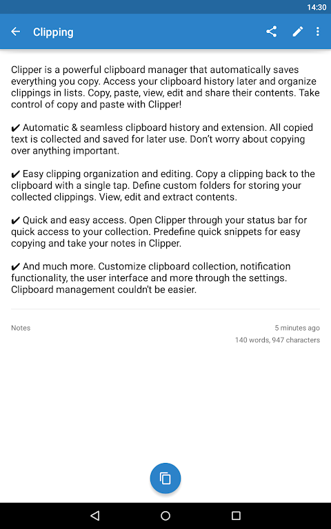 When there is a large amount of duplicated text, searching for a certain clipping among all the copies can be time-consuming and frustrating. The usefulness of Clipper+ can be attributed to its clipping search feature. You only need to quickly make a few taps and identify the clipping you are looking for. This enhanced search tool provides an additional layer of efficiency and convenience to your workflow, ensuring you spend more time on important things and less time seeking content.