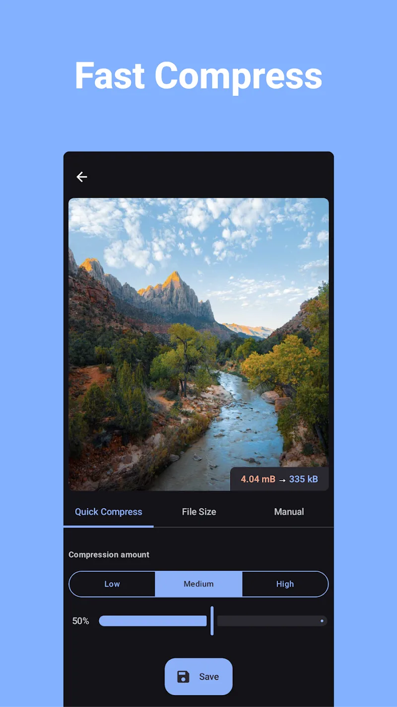 - Multiple Compression Modes: This adjustment will often have many options based on the recommended modes. The app can automatically edit quickly in addition to manually optimizing to suit your needs.