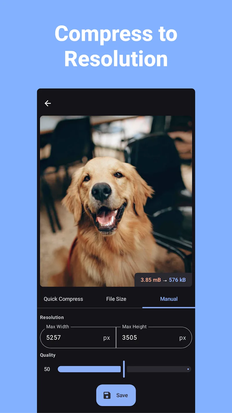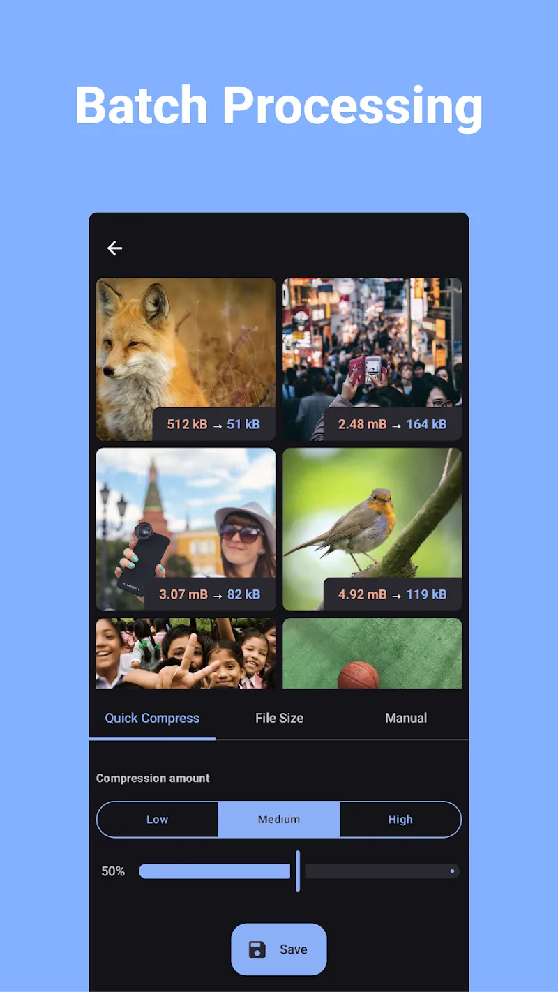 Compress Image becomes a perfect choice for those who have a huge number of images. From there, batch editing will create a lot of free space on the device and do more new things. Good compatibility with images will suggest some accompanying support features that you cannot take your eyes off.