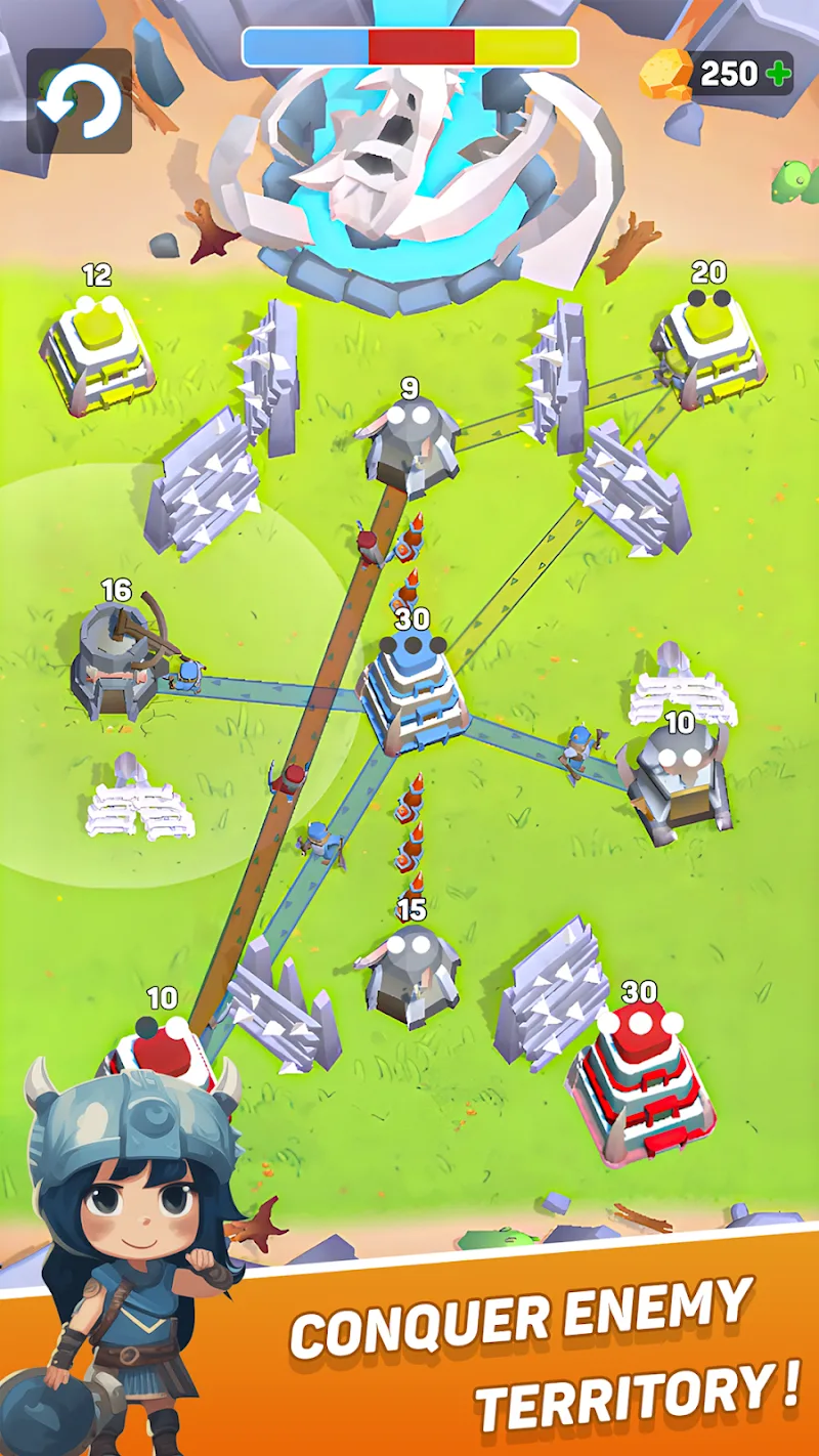- Stunning Visuals Showcase: The battles will take players to explore many new lands. They can fight to gain important territories. The fun is created by connecting towers and upgrading power. Surprise attacks on the opponent’s towers will make you feel satisfied.