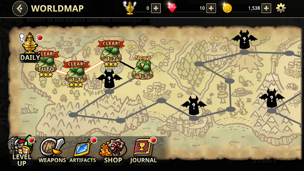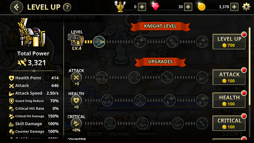 Adventures in Counter Knights will be divided into levels arranged from easy to complex. Each level will be a completely different challenge, and your achievements will be displayed in the number of stars. After winning the battles and completing the tasks that the system gives you, you will be moved to the next level. In addition, you also have the opportunity to receive bonuses and a lot of valuable loot for yourself. However, the higher the level, the more difficulties you will have to face, such as the strength of the monsters, has improved much more. Not only that, but the boss also becomes harder to defeat, so you will need to improve your strength.