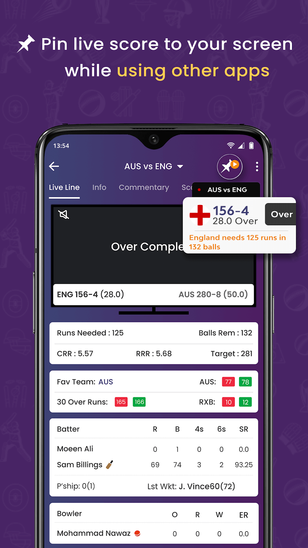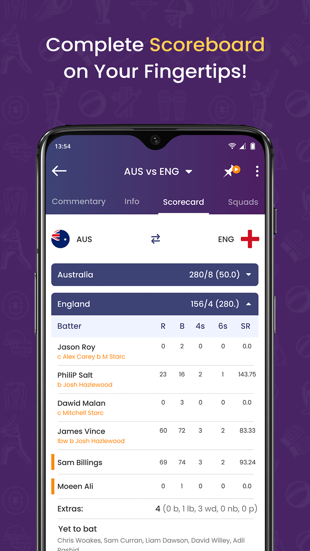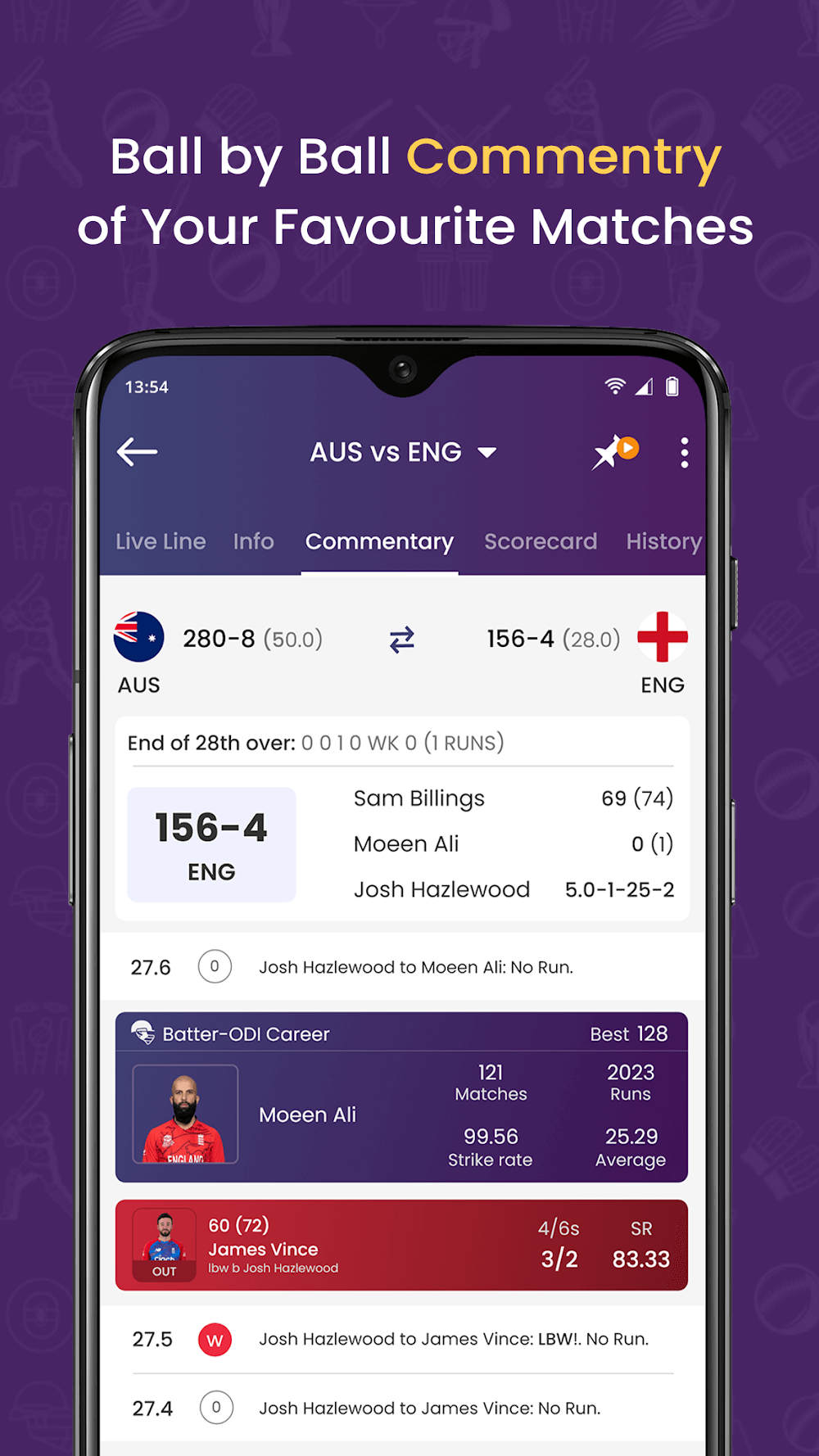 - Detailed Scorecard: Follow commentary and see instant match stats like runs, wickets, etc.