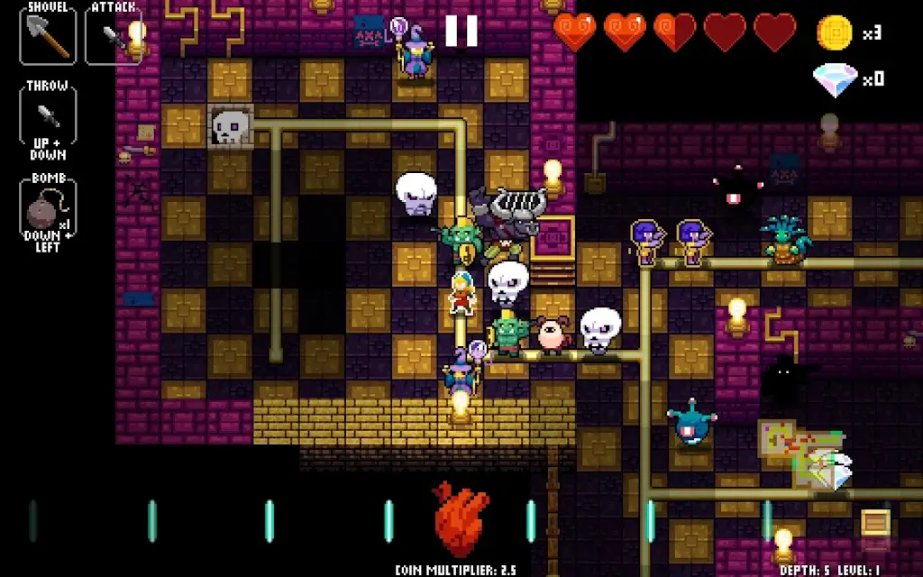 The roguelike aspects in Crypt of the NecroDancer do more than just test your sense of rhythm; they also test your strategic thinking and ability to change tactics on the fly. Each run through the game is procedurally generated, so the levels are always unique, and the gameplay is never the same again. The fact that one mistake might result in having to start over entirely increases the game’s intensity and excitement. Crypt of the NecroDancer has plenty of hard foes, intricate level designs, and secret areas to explore, so you never get bored. Prepare for a thrilling journey where every move matters and the excitement of the unexpected lies around every turn.