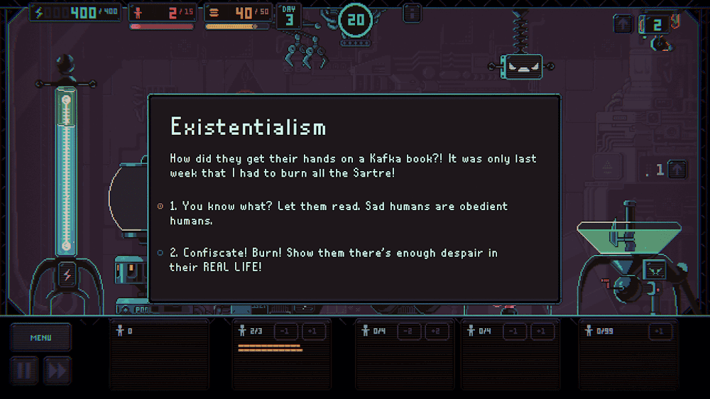 Humans rule the world with their thinking ability, and with that knowledge, they have created AI robots. Artificial Intelligence(AI) think like human and is automated. With this concept, developers designed the game Despotism 3k with extraordinary visuals and ideology where AI control human and conquered the whole world. Humans use machines but reverse gameplay in this game where robots use and control humans. The main character in this game is Master AI which catches a bunch of puny humans and grows the most significant colony. The game contains multiple machines like an Energy reader, Human Storage, Power Generator, Breeding Tube, Food Generator, Bidreactor, and Arms. Upgrade each machine to increase the machine’s capacity and power.
