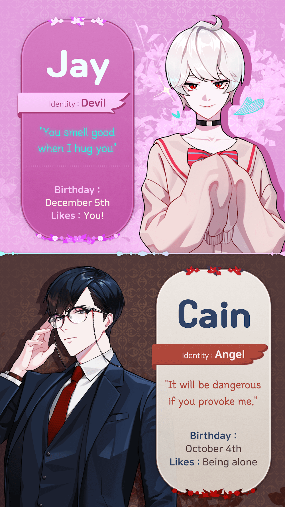 You will interact with four characters from the beginning to the end of the game. There are many interactions, scenes, and complex relationships between them. The first is Arthur, who is significantly younger than the main character and despises being seen as an older brother in any situation. Han may appear cold outside, but he has a soft side and enjoys drinking on date nights, just like the next guy. When you feel down, Jay is always ready to hug you and love you. On the other hand, Cain despised solitude because it bore him. After all, he had no siblings to bother him.