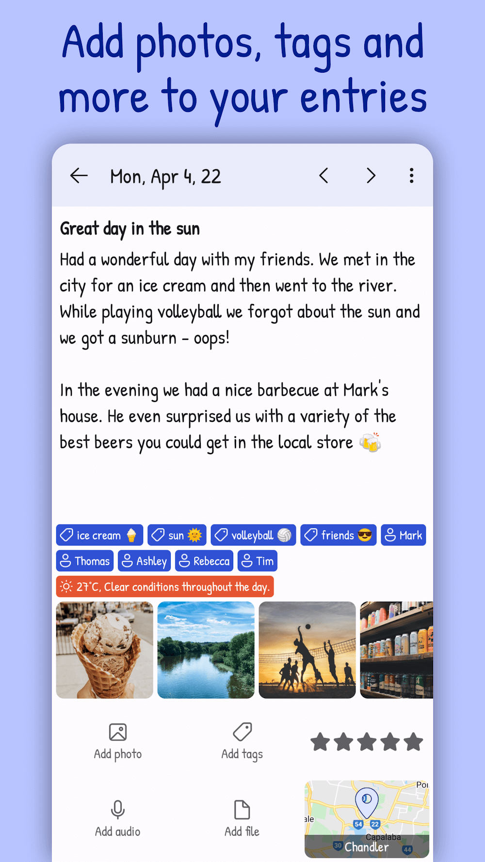 • File attachment: You can attach any type of information to your journal entries. Sometimes, written words can’t fully express what images and sounds can.