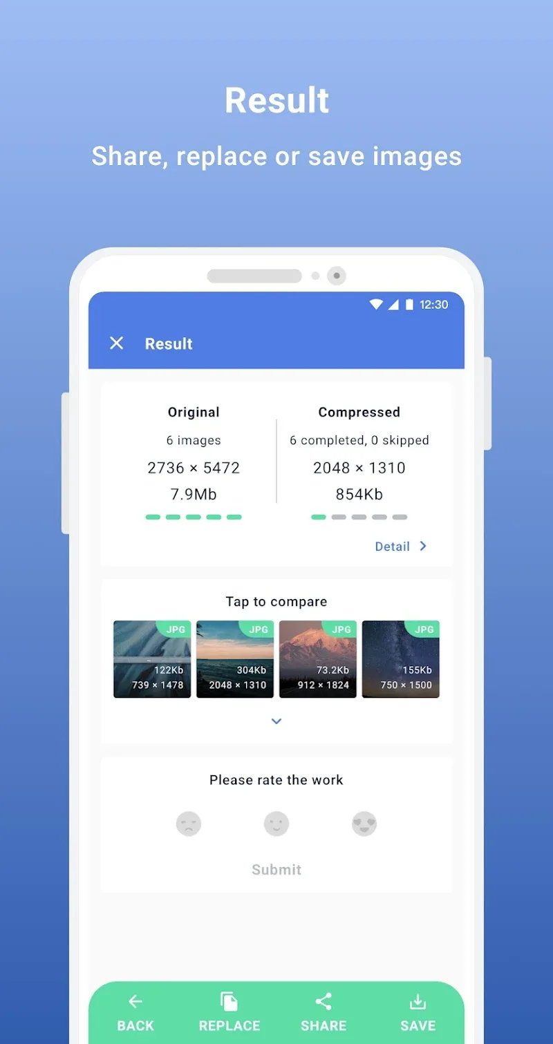Unsure how a compression will affect your images? DotPhoto lets you quickly compare originals against compressed previews side-by-side, so you can tweak settings until the optimized versions look pristine.