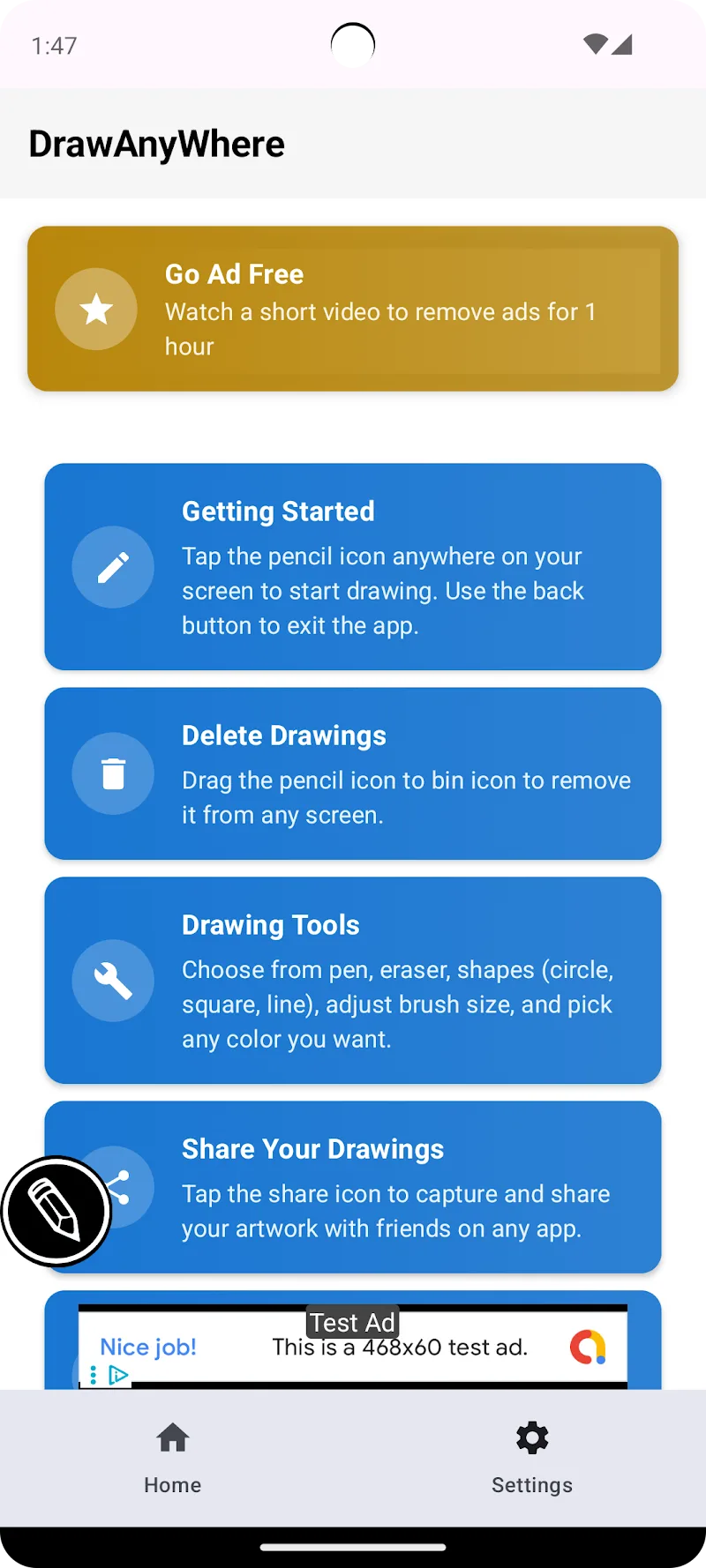 Draw Anywhere will make your device more convenient and smarter. The application allows you to draw freely on your screen without any limitations. With this feature, you can draw and write anything on your device’s screen. With this application, you can use it as both an entertainment tool and a note-taking tool. What are you waiting for? Come and experience this exciting convenience now!