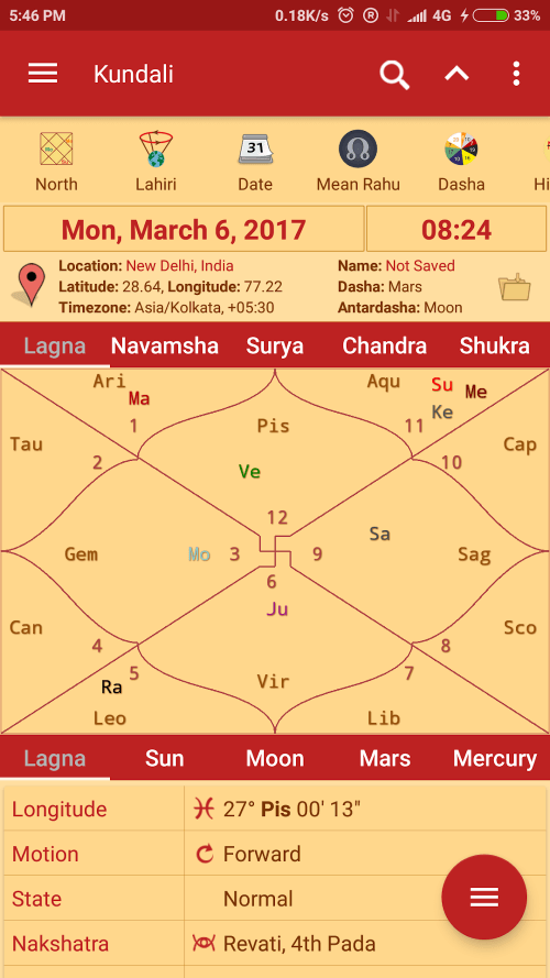 Hindu Calendar features Kundali support, meaning you may make a Lagna Kundali, Navamsha Kundali, Surya Kundali, Chandra Kundali, or Shukra Kundali based on a particular date, time, and place. The precise placements of the Sun, Moon, Mars, Mercury, Jupiter, Venus, Saturn, Rahu, Ketu, True Rahu, True Ketu, Uranus, Neptune, and Pluto are all displayed in the app. The Kundali editor allows users to do tasks on Kundali files, such as saving, editing, deleting, and opening the files. This app will enable you to view your detailed Dasha and Antardasha for the next 120 years, and it further labels each Kundali with the Dasha and Antardasha that are currently in effect.