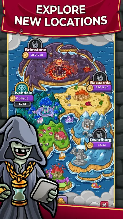 As you amass wealth and reputation in Dungeon Shop Tycoon, you’ll have the chance to establish your business in myriad locations across the realm. From the homely Shireville and mystical Elvendale to industrious Dwarfburg, bustling Bazaarnia, and fiery Brimstone, each site offers unique opportunities and challenges. It’s a whole world of business waiting to be explored!