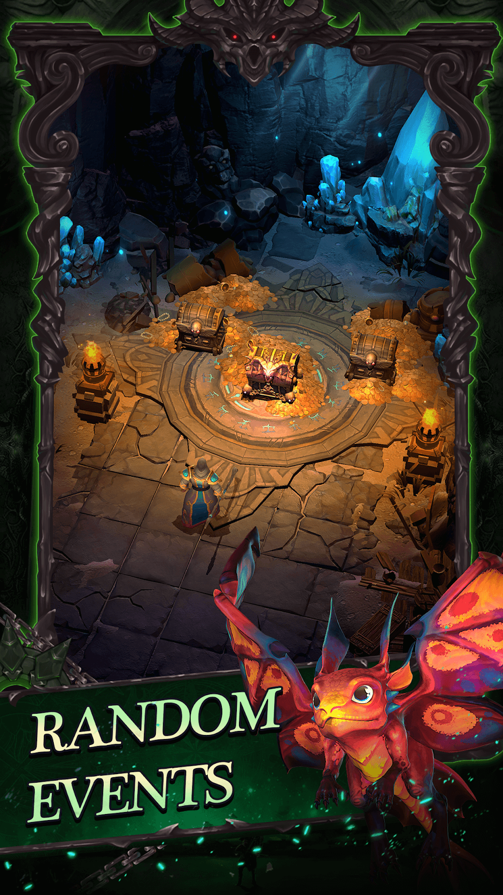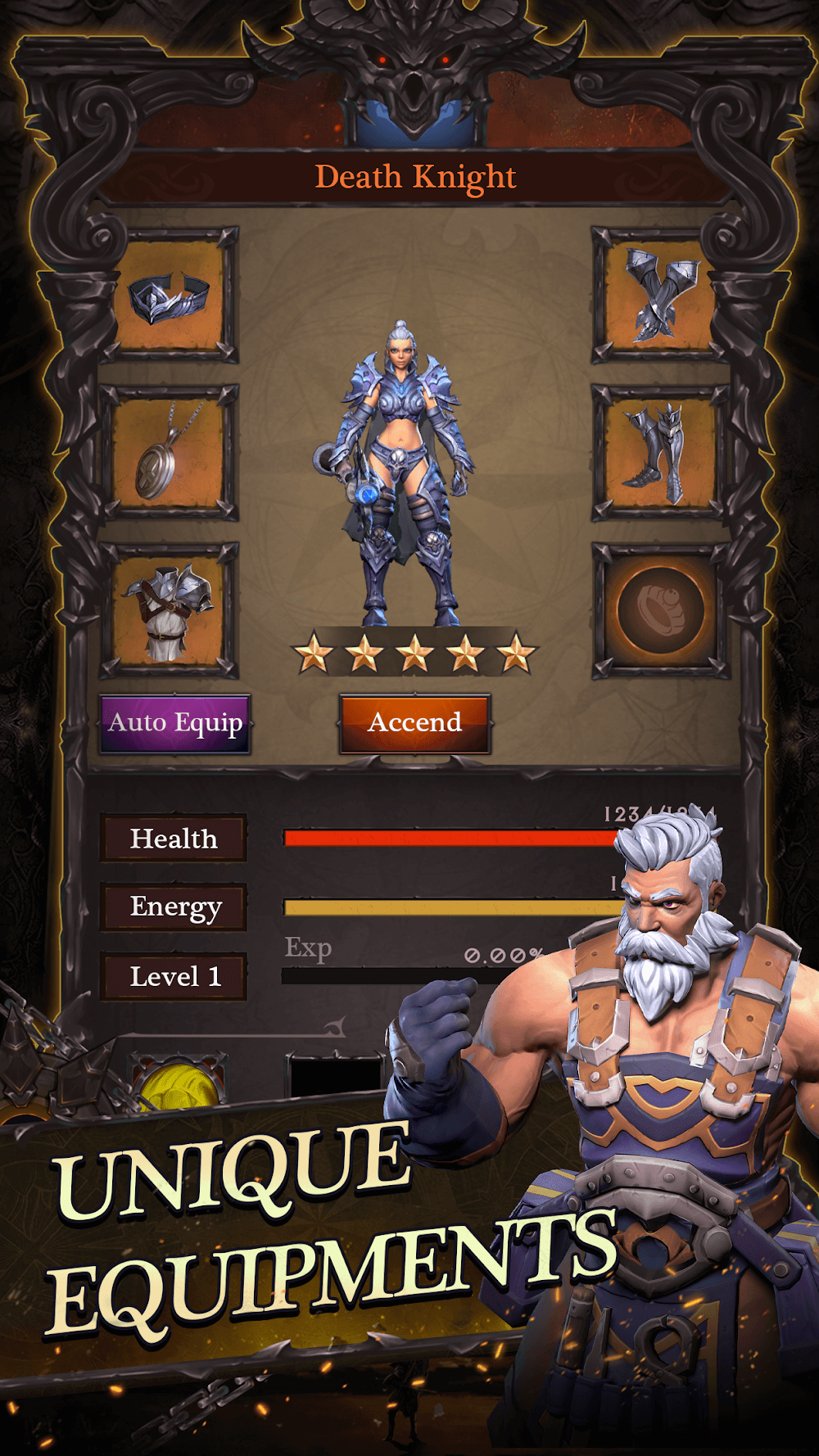 Although the heroes will do the fighting automatically, you can also help by using the additional skills of each character. You must drag the skill to the enemy and wait a while for the skill to recover enough mana before you can continue to use it. Using skills will drain the character’s mana and automatically increase during combat with a maximum of 10 points. After completing each battle, you will accumulate experience points and quickly level up. In addition, along the way, you will also encounter some magical chests and collect valuable equipment such as an exquisite helmet or armor.