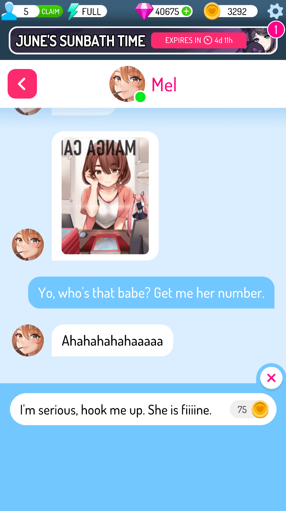 Players will develop conversations and see the character’s emotional milestones continuously increase, which is a positive point that will encourage players to continue completing their missions. At the same time, the interesting point when increasing the level of interaction with the character is that charming selfies can be unlocked. In other words, they have begun to have certain feelings for you, so they will send the photos they consider the most beautiful for you to see and evaluate. That can be seen as a reward that you will try to achieve throughout the game.