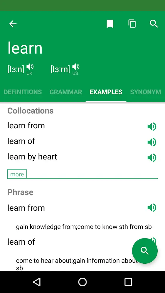 Not stopping there, when you come to this application, you will receive essential and useful grammar-related features. That’s why when you use this dictionary, you not only get common vocabulary information, but we also provide grammar from basic to advanced levels. At the same time, the appearance of examples makes it easier than ever to remember how to use them.