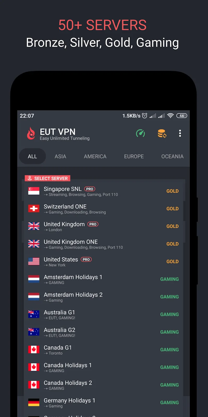 EUT VPN offers options tailored for use cases like gaming and privacy. Low-latency gaming servers reduce ping for smoother online play. Secret servers in privacy-friendly countries anonymize activities like torrenting. There are also high-speed servers for streaming and general browsing. With specialized servers, you can optimize connection performance for your needs.