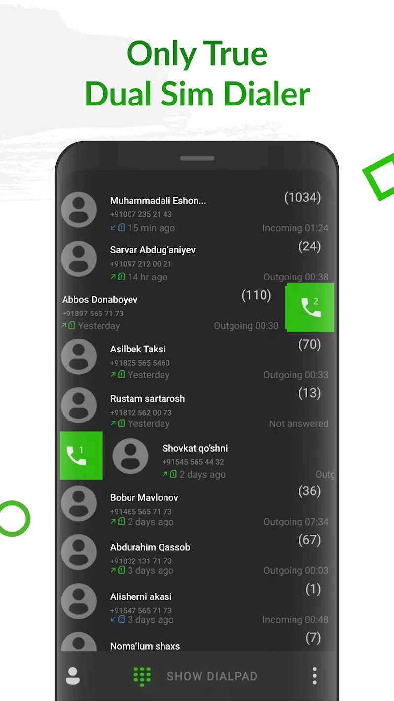 At its core, ExDialer enables easy dual SIM dialing through customized swiping. Assign gestures like swipe left for SIM 1 and right for SIM 2. Swipe up for WhatsApp or down for SMS. Adapt swipes to quickly use your preferred apps. Simple directional controls streamline dialing and messaging.