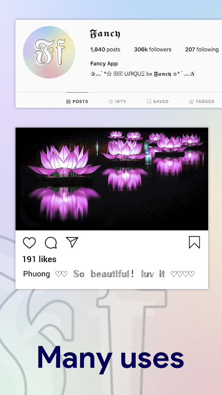Any feature of Fancy Fonts is applied across different platforms. For example, users can create a special character string and copy it into the message line to express their feelings. Sometimes, they access the application to find a font to decorate their social network profile. A beautiful interface often attracts many people to explore and can increase the number of followers for the account. Therefore, using the right font creates unexpected effects, and switching between different options is often not too difficult. You just need to swipe and tap the appropriate font to continue using.