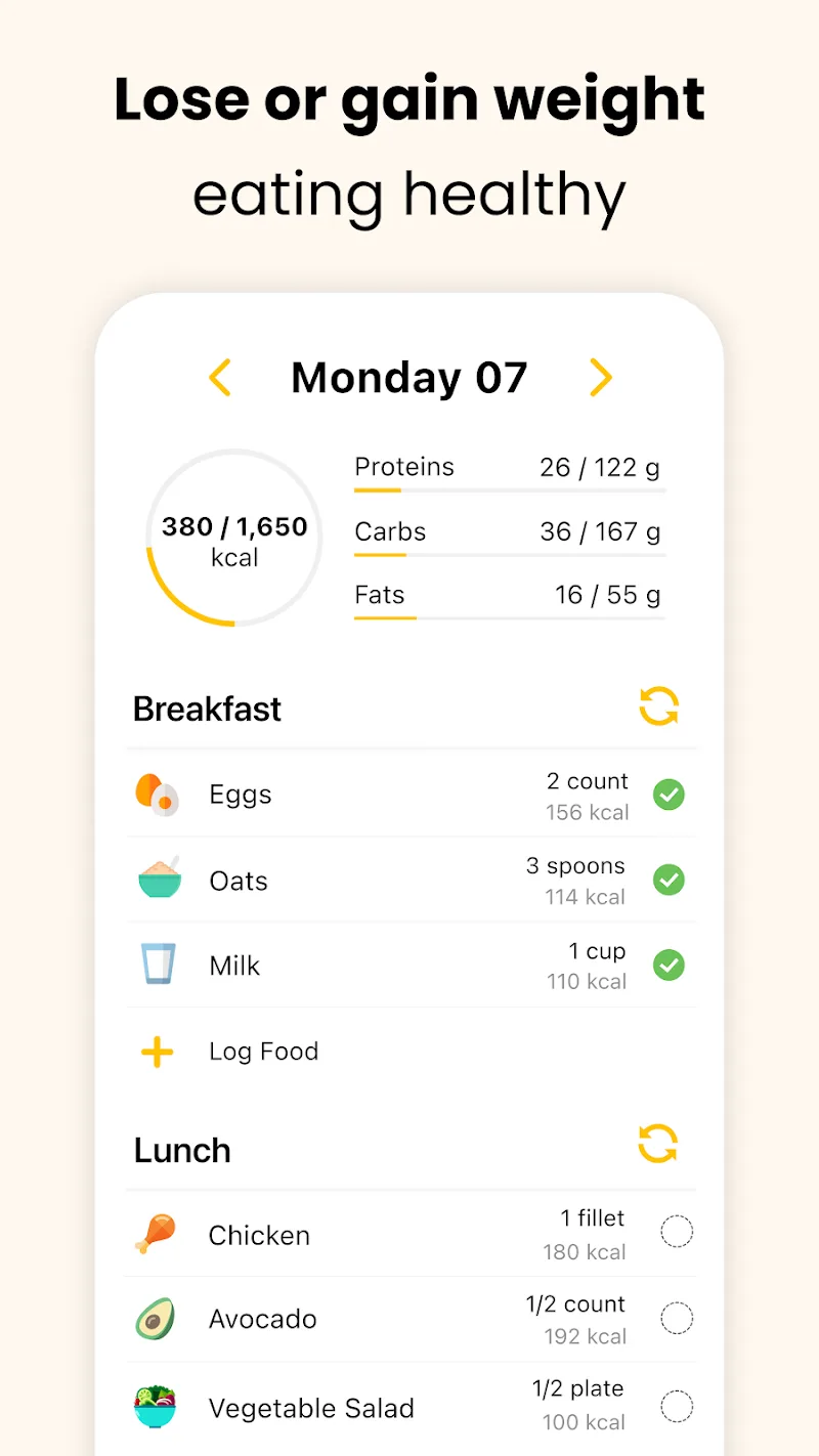 - Preset calorie intake: The interesting thing is that the application will update and change your calorie and macro goals daily to match the plan.