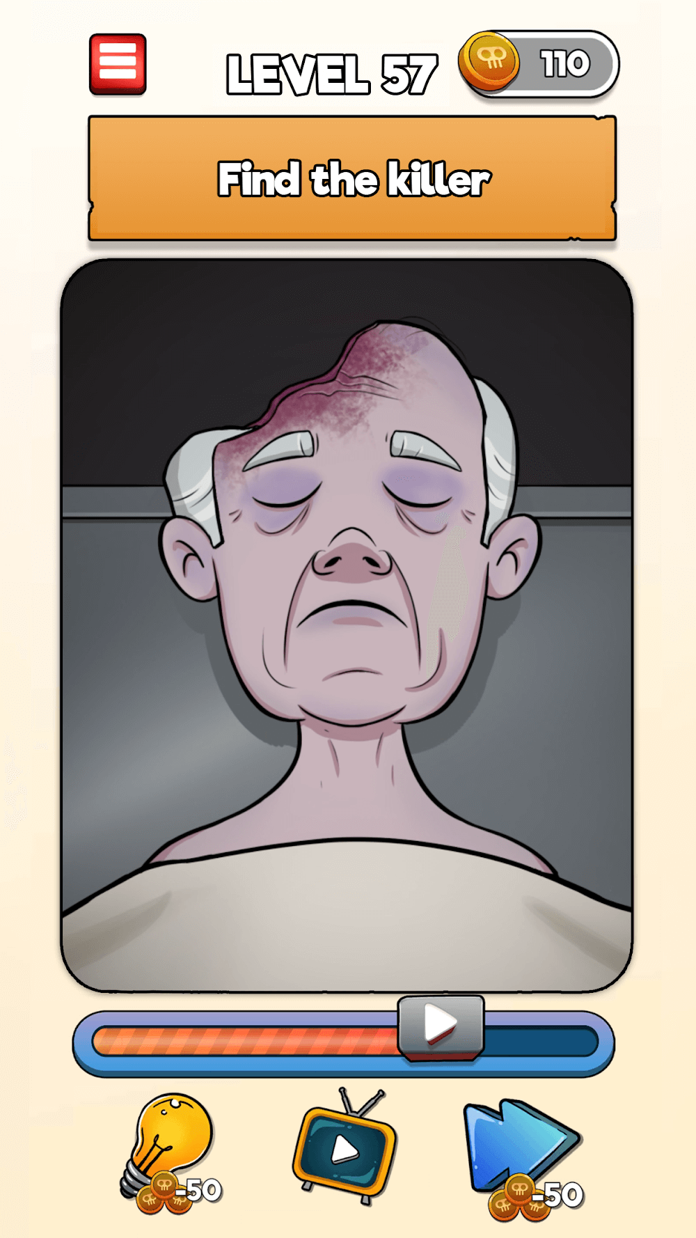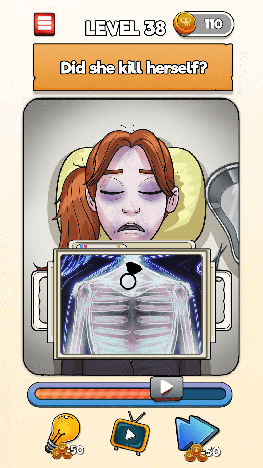 In level 1, find who is dead, and so on; your tasks are like, is the baby alive? Did she notice the train? Is he alive? Find the killer? Who is dead? Is he a smuggler? Find the haunted one? Tap on the item that killed her; did he cheat? etc.? In this way, each level has questions to find the solutions. You can collect daily bonuses for up to 7 days. To manage those rewards, play the game continuously for seven days without any breaks. You can also get free hints, or if needed, you can buy the extra tips with earned coins. Click on the side arrow to jump to the next level without finding the answer of that level, and it may cost some amount. Starting levels are like a warm-up to your brain’s thinking ability; later on, levels are hard to find solutions to and tricky ones to solve.