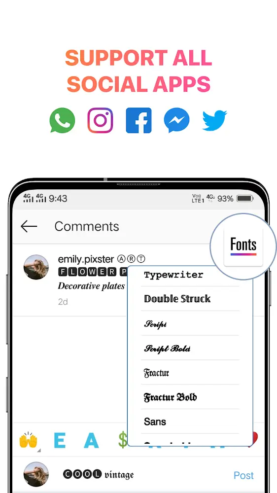 Create a unique social media presence with stunning intro text. Those who are pursuing a career in creating content on social platforms should not miss Cool Fonts for Instagram. Instagram profiles should be invested in appearance to help you attract more followers. The application supports zooming in and out of text content on other platforms depending on your usage needs. Just enter the full text and choose the style. The appropriate icons will be suggested on the screen, and you just need to move them to the desired position.