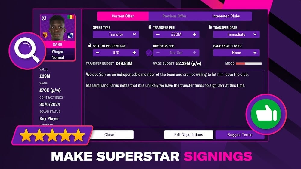 Improved scouting methods have helped bring in more “wonder kid” candidates. Your backroom staff will be put to work if you specify the player characteristics you are looking for. Take advantage of our competitive and realistic transfer market. You can focus your recruiting efforts by responding to multiple offers from prospective players.
