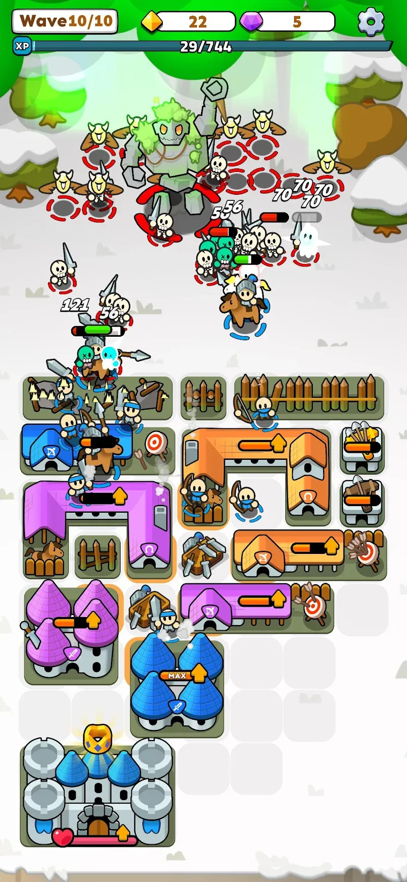 This game has perfectly combined the merge mechanism and tower defense. Fortress Merge: Puzzle Defense is like other tower defense games, where hordes of monsters are trying to approach your house. When they rush into the house, you will definitely lose. But the preparation will end before the monsters rush in; that is the difference. Each level will have more than 3 waves. Between each wave, you will have a gap to find different pieces to upgrade your building. Two identical pieces will upgrade a building into a stronger one.
