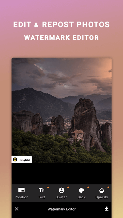 Utilizing the cutting-edge editor within the app, you can adjust the text, colors, avatar, opacity, and watermark position on various photos before reposting. The features can further be customized with your preferences to increase its effectiveness in handling photos or expand its format compatibility. Moreover, you don’t need to upload photos, as downloaded photos are memorized in this app and act as a shortcut to save you extra time editing photos.
