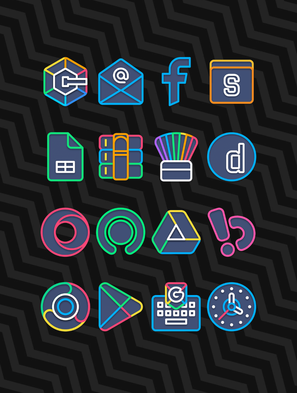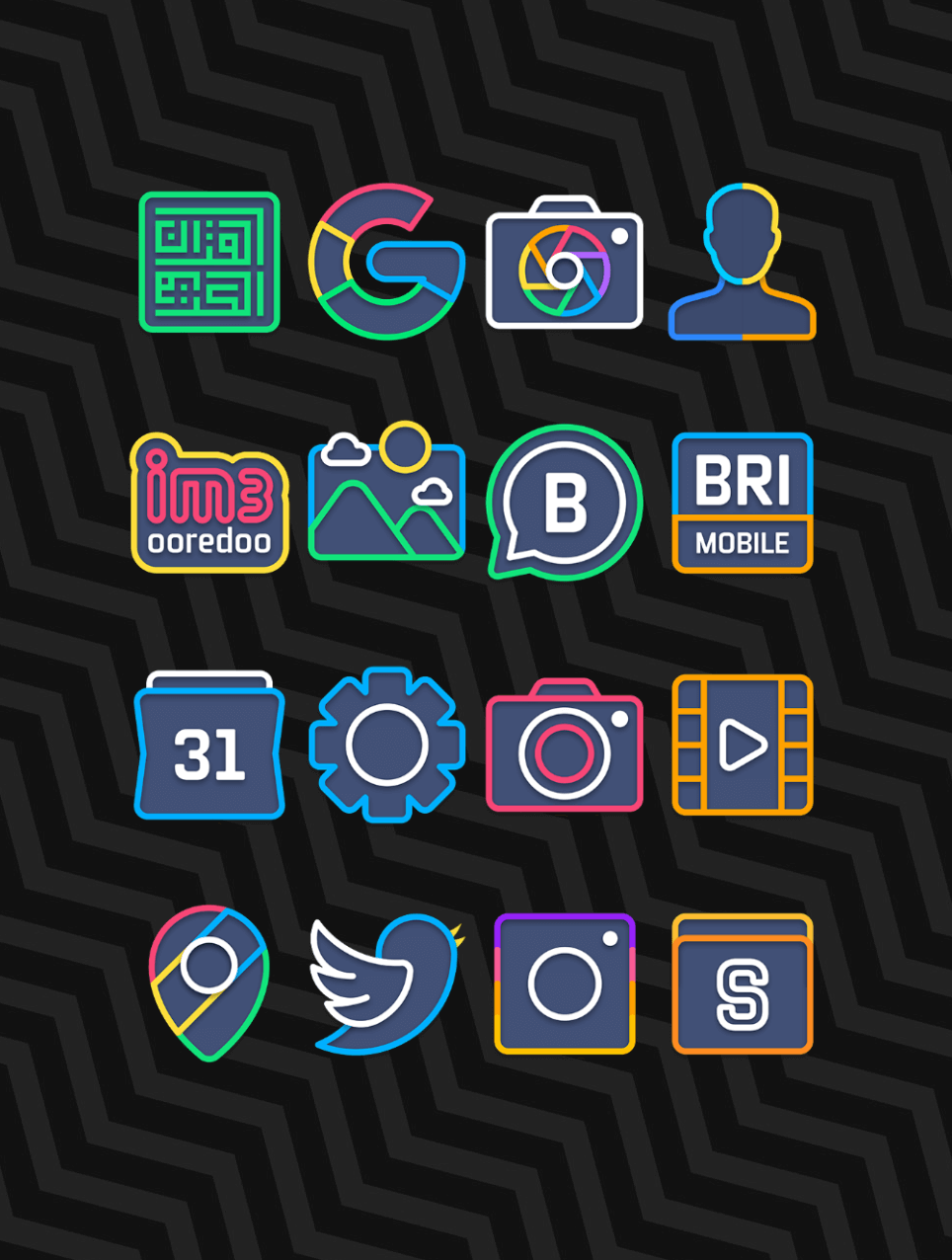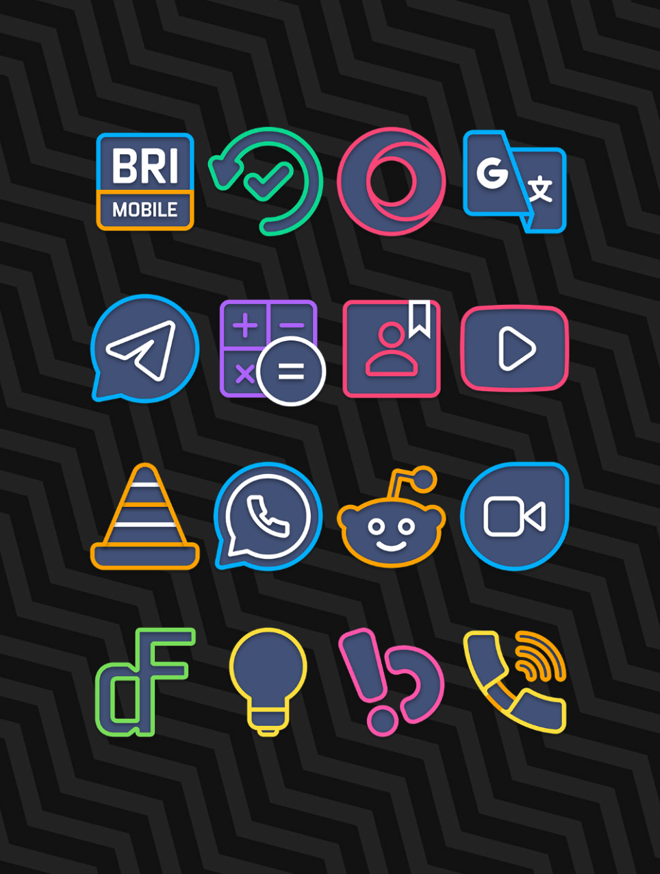 Current operating system updates make the user interface dark to preserve battery life. All the application’s icons are designed to work well with black backdrop interfaces. Icons will be colored in a neon manner with plenty of brilliant colors that mix and stand out in the dark.