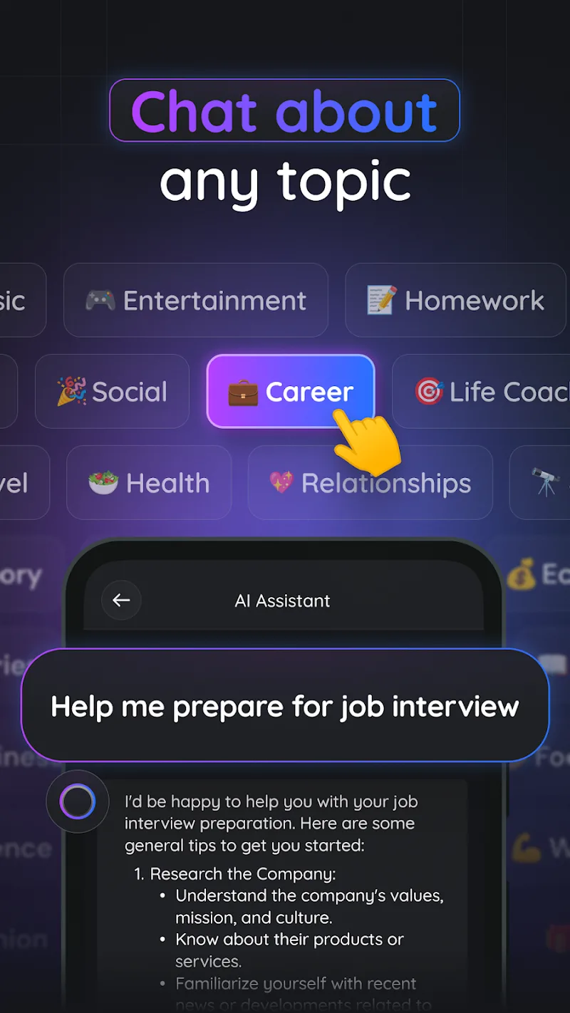 Gemmy AI: Chat & Assistant is an application designed to bring useful experiences that users can change the way they use their technology devices. The application will provide users with the ability to chat directly with an extremely intelligent and advanced artificial intelligence (AI) system that has been carefully trained. Users will now be able to turn this application into a main Q&A tool where they can find any information or seek support in life.