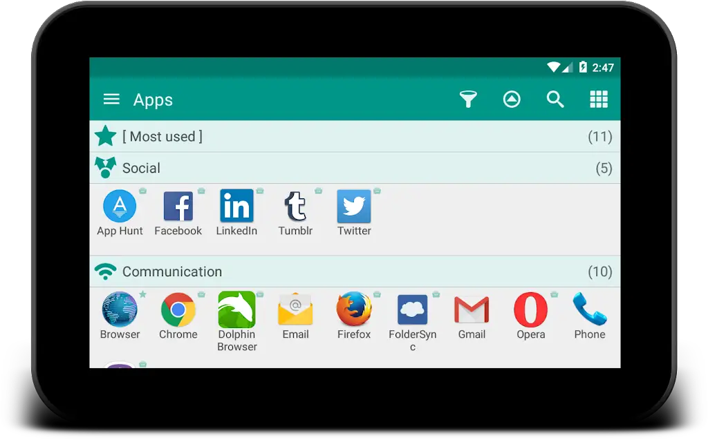 Glextor App Folder Organizer creates layouts that make it easier to organize applications. Categories are often classified very quickly over time. In particular, protected applications often have an APK version for convenient backup.