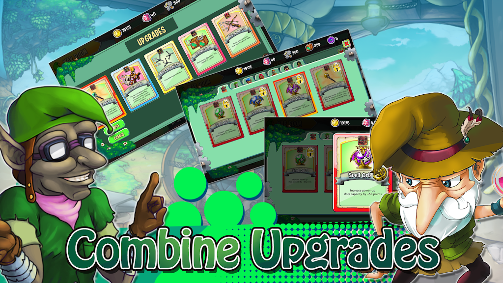 The game has both power-ups and over 30 different upgrading options. The player can earn new cards and add them to their deck in various ways to improve their offense and defense. The options for personalization are practically limitless, with additions like larger elf squads and faster archer assault speeds.