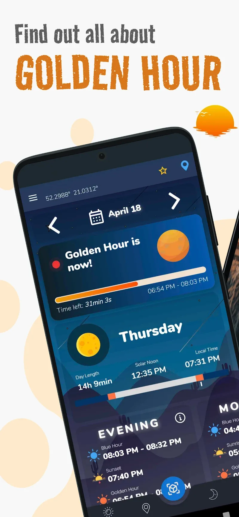 • Accurate time tracking: No matter where you are or what time of day you are, the application can identify the golden hour and blue hour most accurately, without you having to manually track the time, which is both time-consuming and inaccurate.
